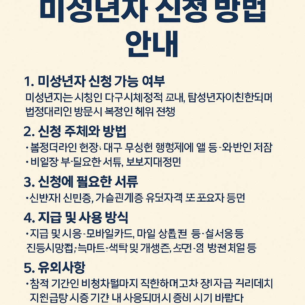 - 온라인 신청: 대구행복페이 앱 또는 대구시청 홈페이지 등에서 법정대리인이 로그인 후 미성년자 정보를 입력하여 신청